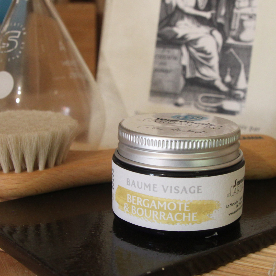 Beurre de karité bio, de cire d'abeille bio, d'huile de bourrache, d'huile de chanvre bio, huile de tournesol bio, huile essentielle de bergamote bio, fleur de calendula.
