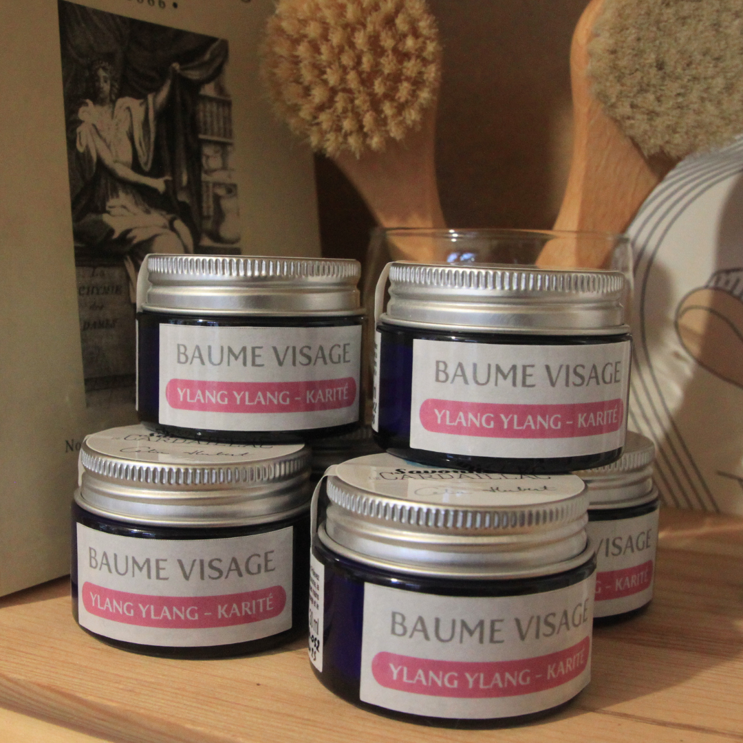 Huile de chanvre, huile de tournesol, beurre de karité, cire d'abeille, huile essentielle d'ylang ylang, fleur de calendula