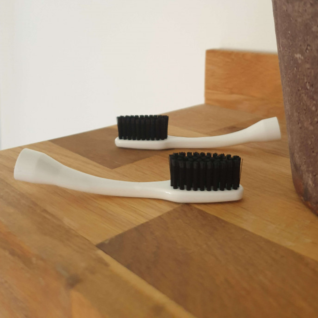 Étui de 2 têtes de recharge pour le manche Édith. En plastique recyclé, elles permettent de ne renouveler que 20% du poids de la brosse à dents. Les filaments sont en nylon à base végétale.