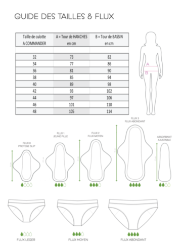 Disponible du 32 au 56 afin d'avoir un meilleur confort que des tailles trop larges (S,M,L,XL). Nous vous conseillons de prendre votre taille de culotte habituelle. Et si vous hésitez entre deux tailles, choisissez la plus petite. Nos culottes sont légèrement élargies pour plus de confort pendant les règles.