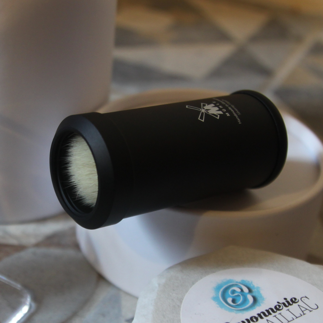 Humidifier votre blaireau et frottez-le à votre savon de rasage en mouvements circulaires