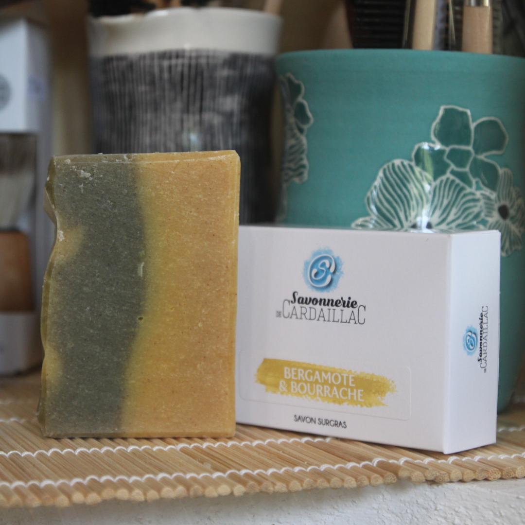 Huile d'olive saponifiée, huile de coco saponifiée, beurre de karité saponifiée, huile de ricin saponifiée, huile de sésame saponifiée, huile de bourrache, eau, glycérine, huile essentielle de bergamote, huile essentielle de cèdre de l'atlas, ortie en poudre, curcuma en poudre.