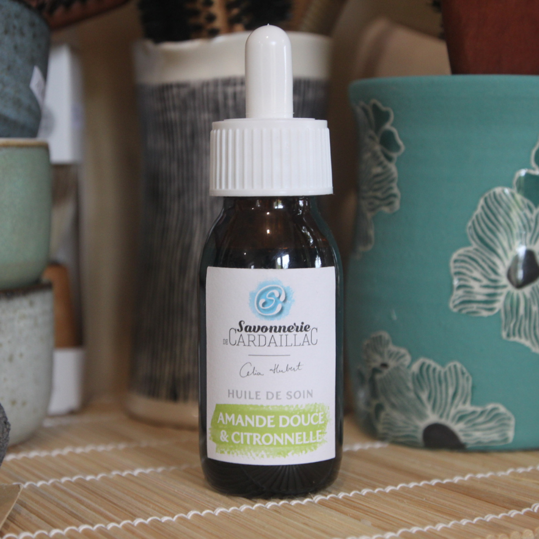 Huile de chanvre, huile d'amande douce, huile de neem, huile essentielle de lavandin, huile essentielle de géranium, huile essentielle de citronnelle
