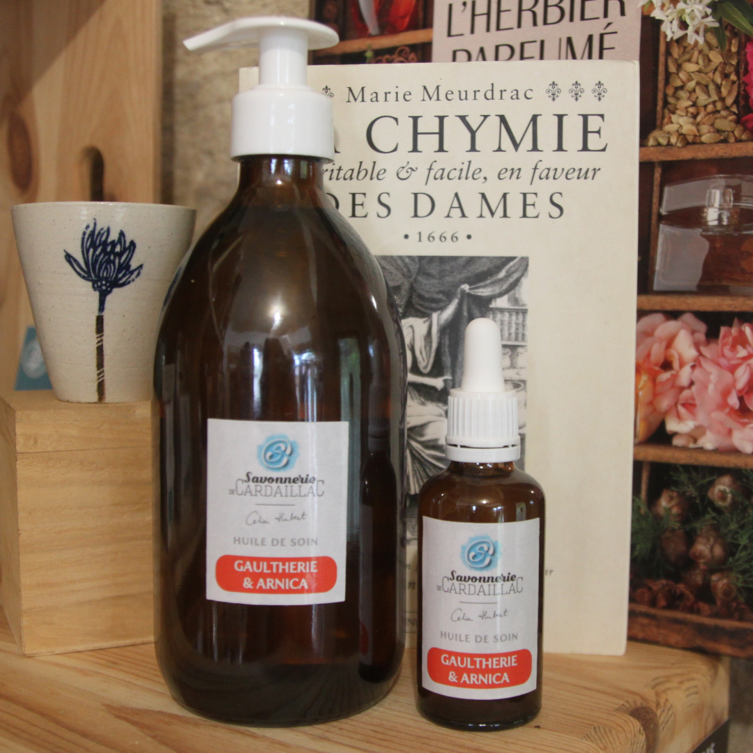Huile de tournesol, huile de sésame, huile d'olive, huile essentielle de gaultherie, huile essentielle de lavandin, huile essentielle d'eucalyptus, huile essentielle de menthe poivrée, extrait d'arnica.