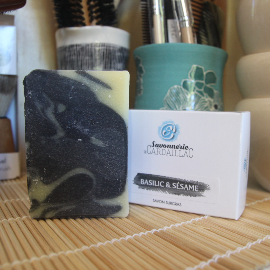 Huile d'olive saponifiée, huile de coco saponifiée, beurre de karité, eau, glycérine, huile de tournesol saponifiée, huile de sésame, huile essentielle de lavandin, huile essentielle de basilic, poudre de charbon.